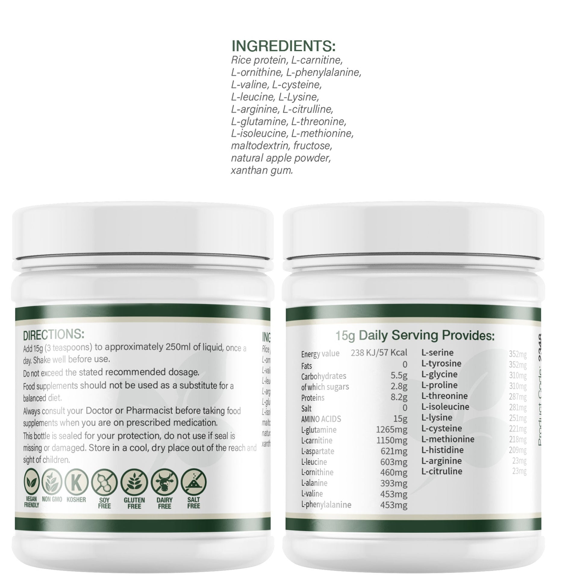 - Includes BCAAs: Leucine Isoleucine & Valine